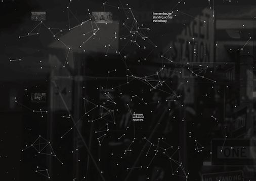 The beginnings of a collaborative gathering: By collecting image, film, and text from Manhattan residents, I hope to build a fluid narrative of the city that encompasses it’s past and as seen through the eyes of its inhabitants. Viewers submit content that is added to a generative web of stories. The web becomes interactive…easily manipulated and explored by the user.