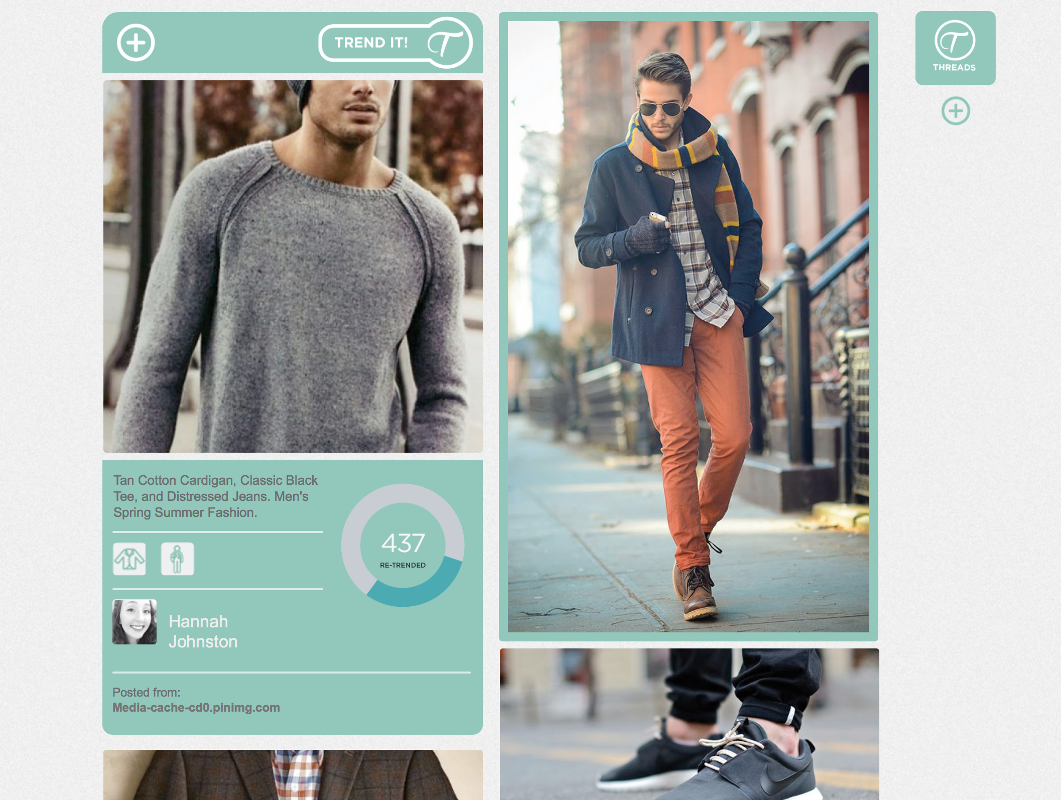 An inspirational platform that sources and share all fashion trends.The product should feel as if it was a extension of the clothes in which they are wearing. Users will have establish a of feeling be current with the latest fashion trends and personalize. Users personal preference in fashion will be intuitively recommended by a feed.
